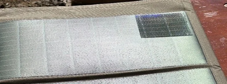 Photo of a PowerFilm panel with reflection suppression due to SMS’s Solar-Enhancing Film on the top, right corner